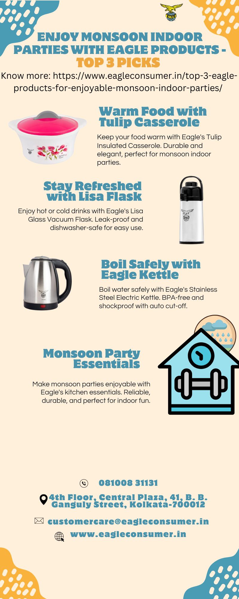 Enjoy indoor parties this monsoon with Eagle's insulated casserole, glass vacuum flask, and stainless steel electric kettle. Know more https://www.eagleconsumer.in/top-3-eagle-products-for-enjoyable-monsoon-indoor-parties/