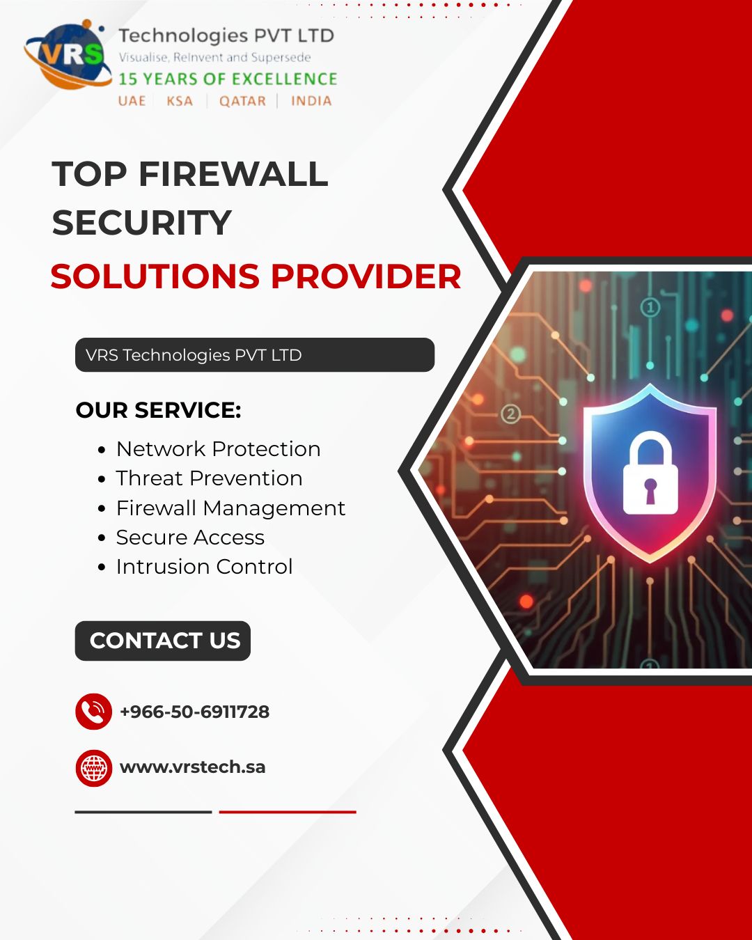 VRS Technologies is a Top Firewall Security Solutions Provider, delivering advanced firewall protection for businesses of all sizes. We secure networks against cyber threats with reliable, scalable solutions and expert support. Call +966-50-6911728 for trusted firewall security services.