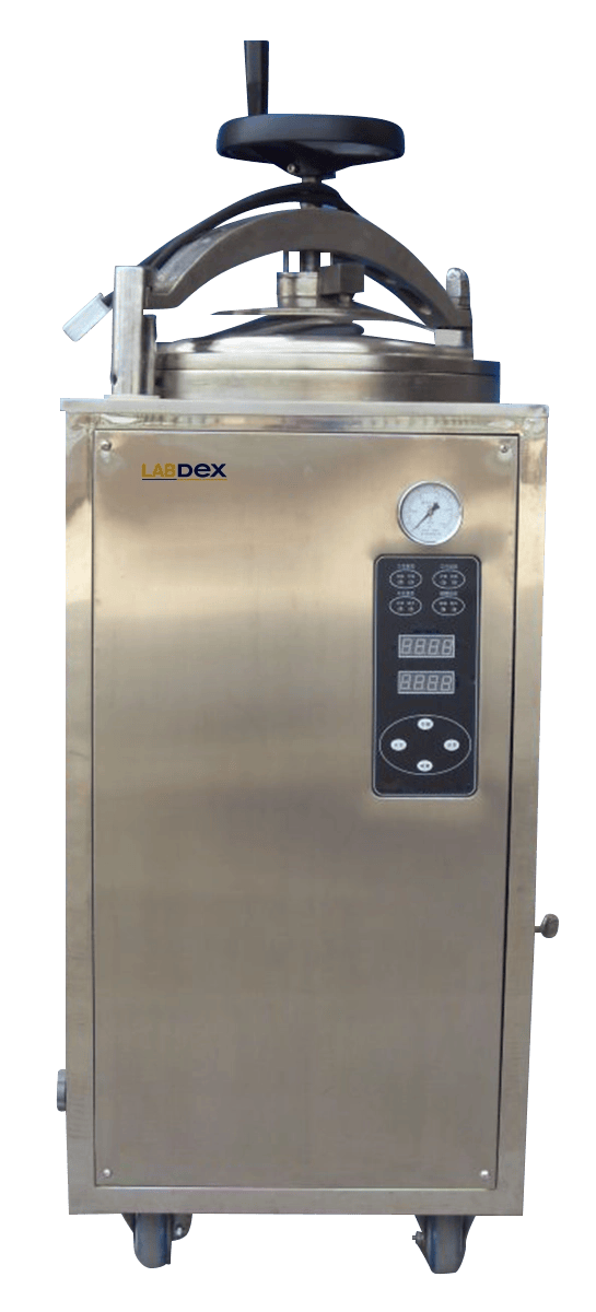Labdex Top-Loading Autoclave is a 50 L automatic vertical unit designed for sterilizing medical instruments and media. It features a 304 stainless steel chamber, 50–126°C temperature range, LCD status display, hand wheel door, safety interlocking, drying function, automatic water inflow, steam exhaust. Beep on.