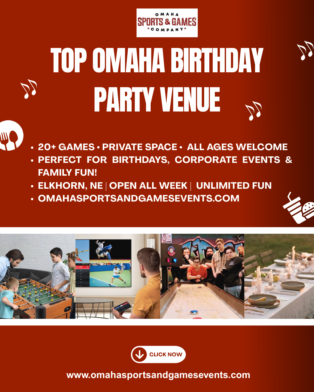 Host your next celebration at the best Omaha birthday party venue with games! Enjoy 20+ exciting activities like foosball, air hockey, golf simulator, and more in a private event space perfect for all ages. With BYOB options, a full kitchen, a giant quad-screen TV, and flexible booking all week, your party is guaranteed to be unforgettable. Whether it’s a kid’s birthday or an adult gathering, this venue has everything you need for nonstop fun and stress-free planning.