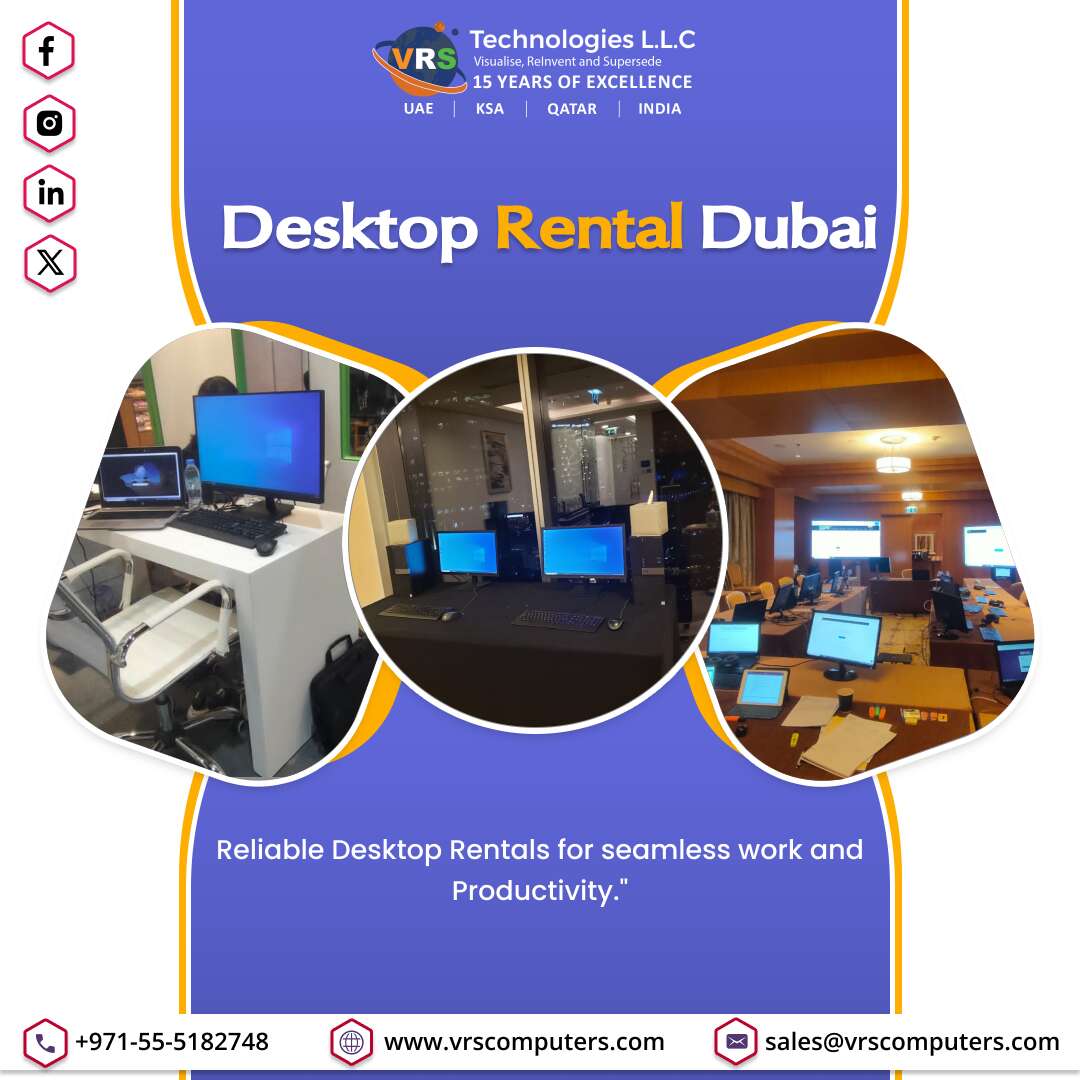 Looking for reliable Desktop Rental Dubai solutions? At VRS Technologies LLC we offer top PC rentals which are ideal for businesses and events. Affordable, easy to use, and delivered quickly to your location in Dubai. Call us at +971-55-5182748.