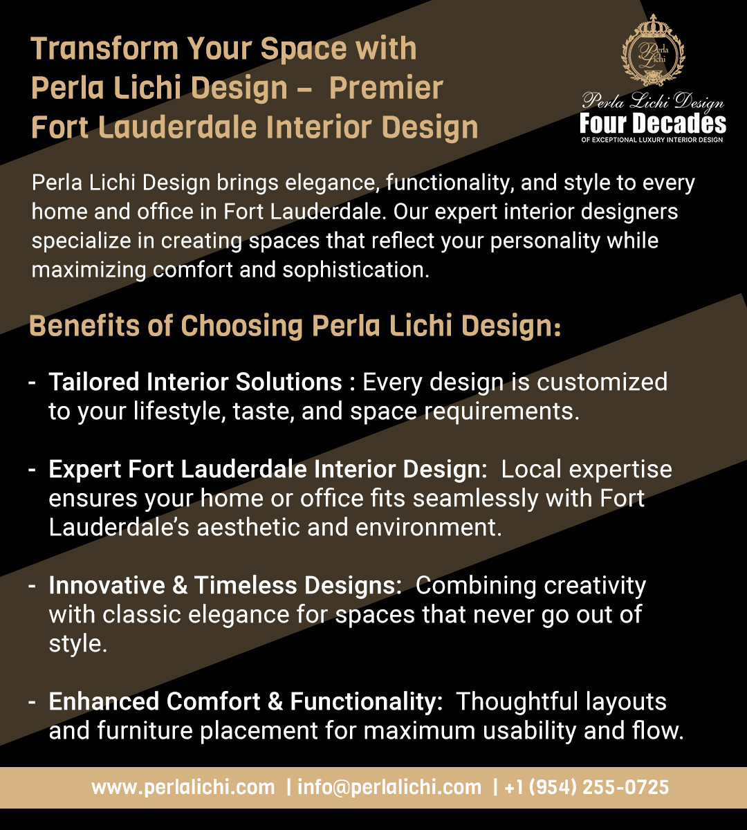 Perla Lichi Design brings elegance, functionality, and style to every home and office in Fort Lauderdale. Our expert interior designers specialize in creating spaces that reflect your personality while maximizing comfort and sophistication.