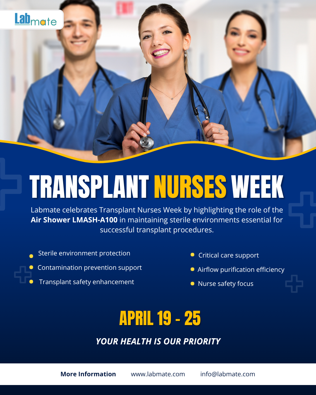 In celebration of Transplant Nurses Week, Labmate highlights the essential role of the Air Shower LMASH-A100 in maintaining sterile environments critical for successful transplant procedures. This vital tool ensures contamination control, supporting the dedicated efforts of transplant nurses to safeguard patient health and enhance transplant outcomes.