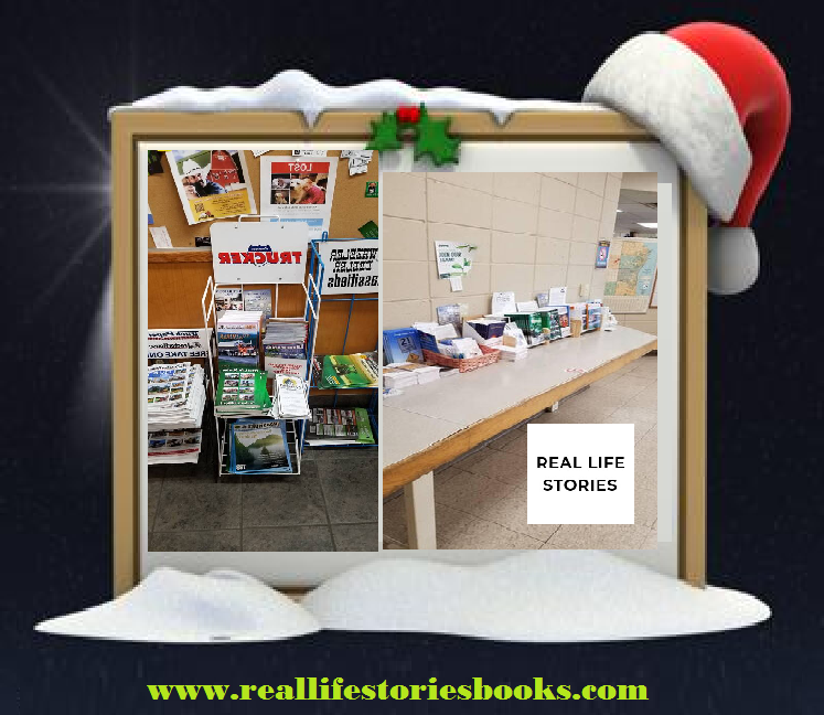Real Life Stories Truckers Edition1 are being given away Freely through many Truck Stops across North America. If there is a Truck Stop near you, You can go in and get permission to place a Book Display like the one below, so Truckers and other people can freely take the books!Reallifestoriesbooks.com
