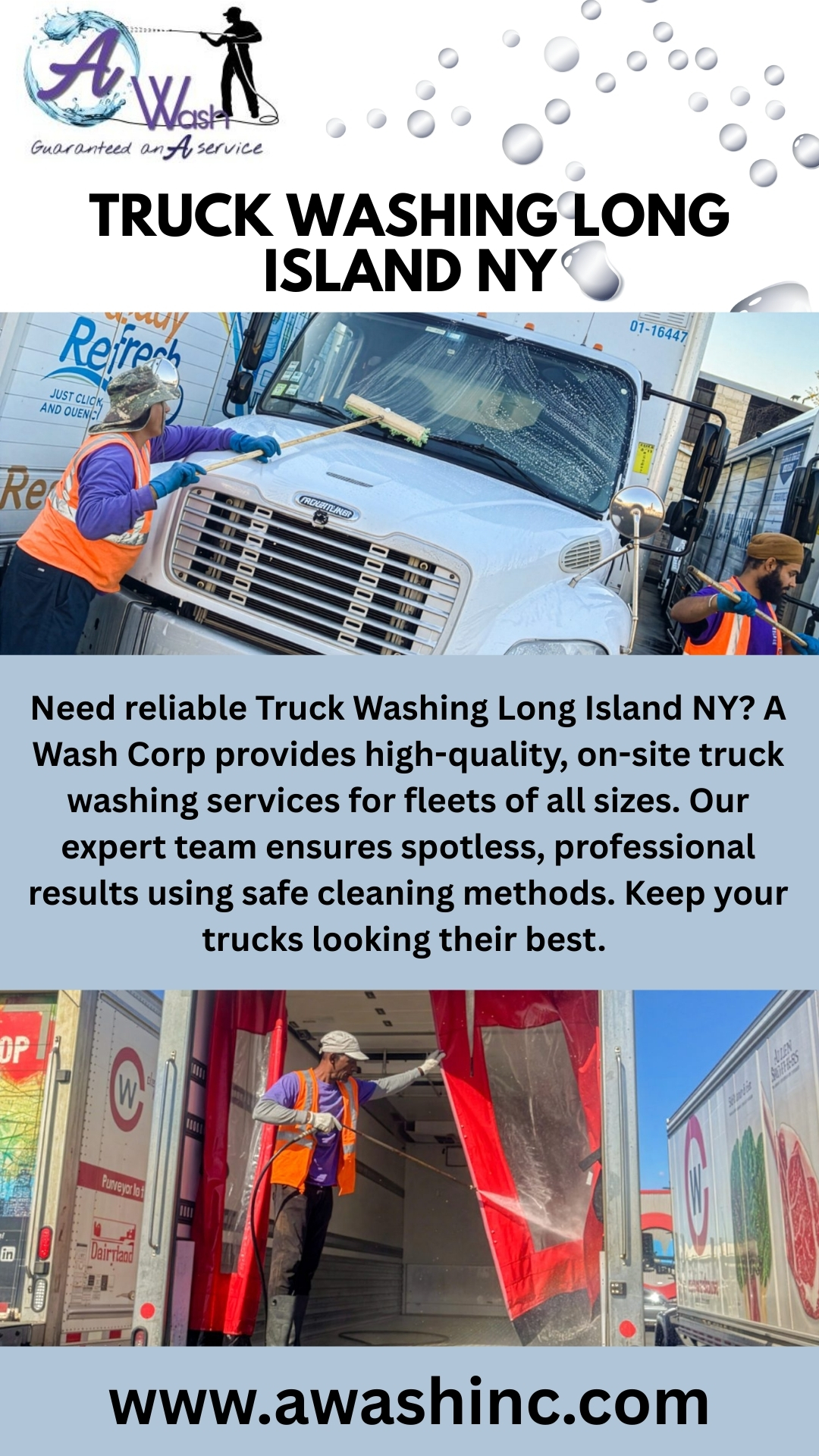 Need reliable Truck Washing Long Island NY? A Wash Corp provides high-quality, on-site truck washing services for fleets of all sizes. Our expert team ensures spotless, professional results using safe cleaning methods. Keep your trucks looking their best. Call A Wash Corp today at (516)-589-1179.
