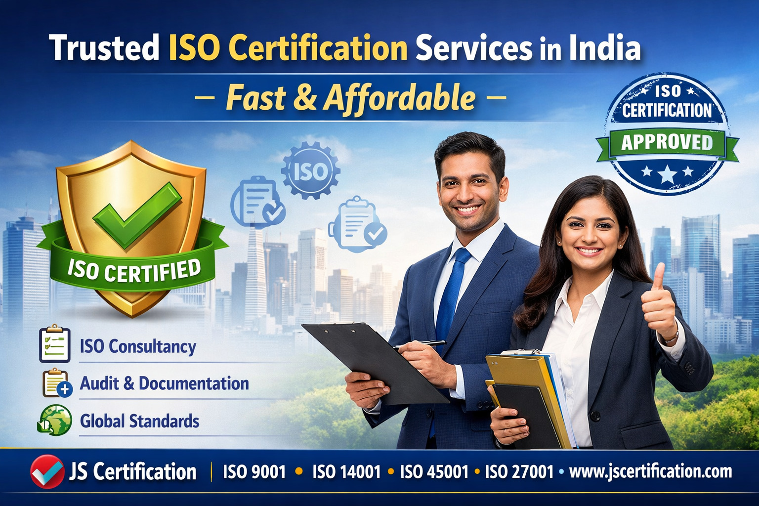 Get reliable ISO certification services in India with JS Certification. We provide expert consultancy, documentation, audit support, and certification for ISO 9001, ISO 14001, ISO 45001, ISO 27001, and more to help businesses achieve global standards. Visit: https://jscertification.com/