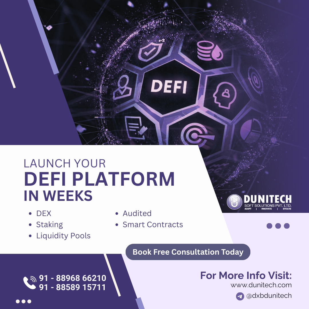 Dunitech helps entrepreneurs build scalable DeFi platforms with secure smart contracts, staking features, and liquidity pools. Start your blockchain project today. #CryptoPlatform #BlockchainDevelopmentCompany #Web3Business