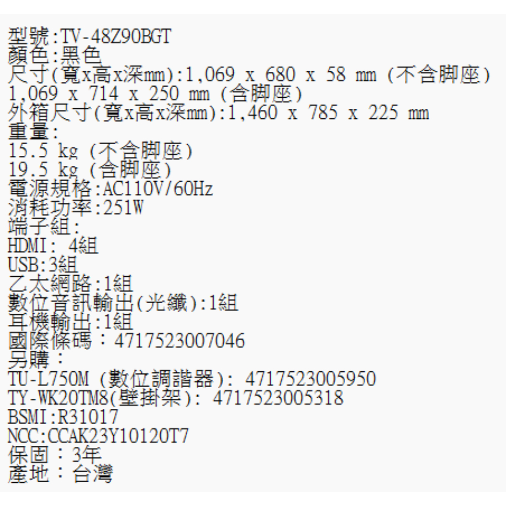 TV 48Z90BGT規格