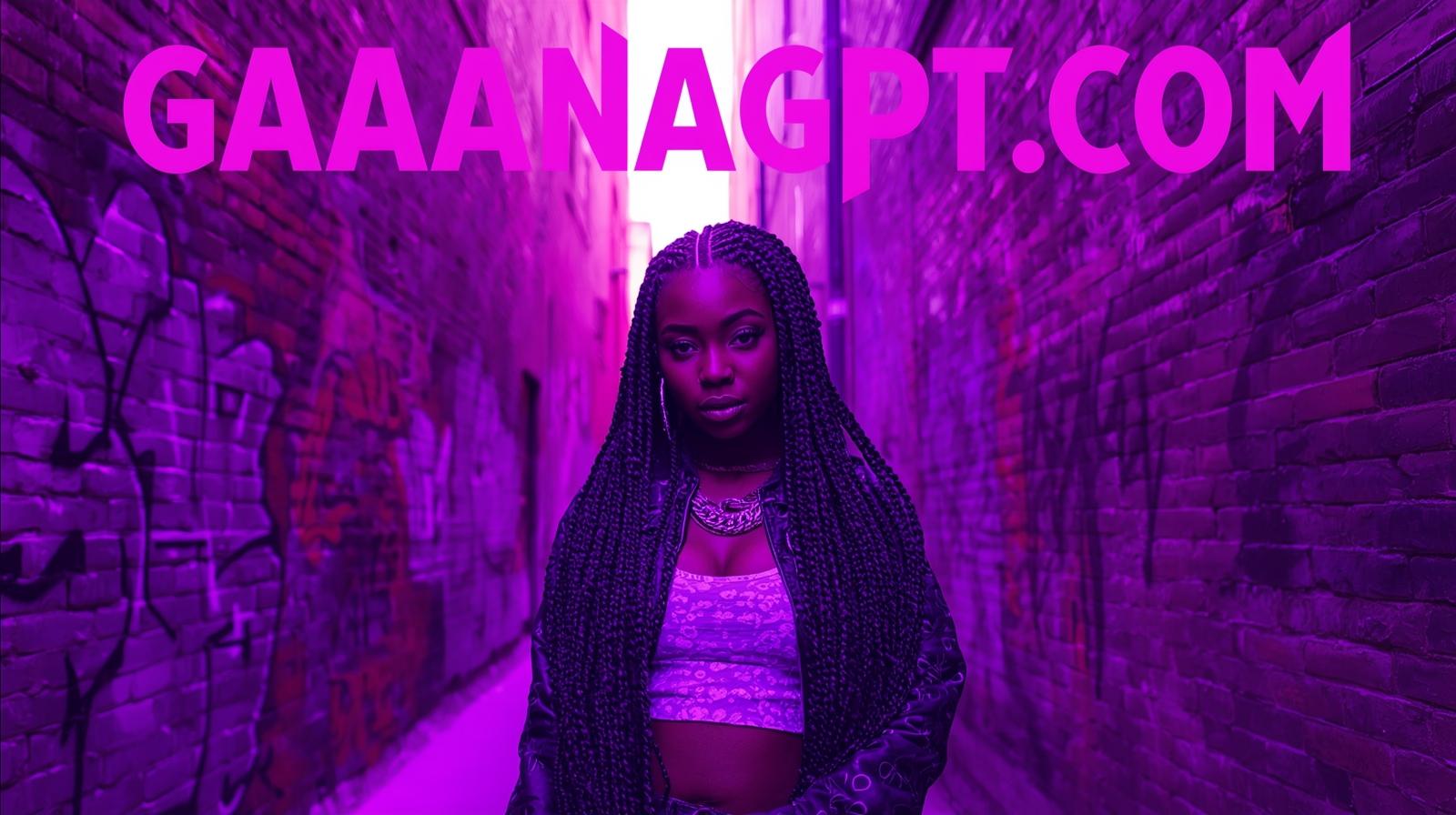 Urban female rapper with braided hair, neon purple alleyway, graffiti textures; “GaanaGPT.com” acros