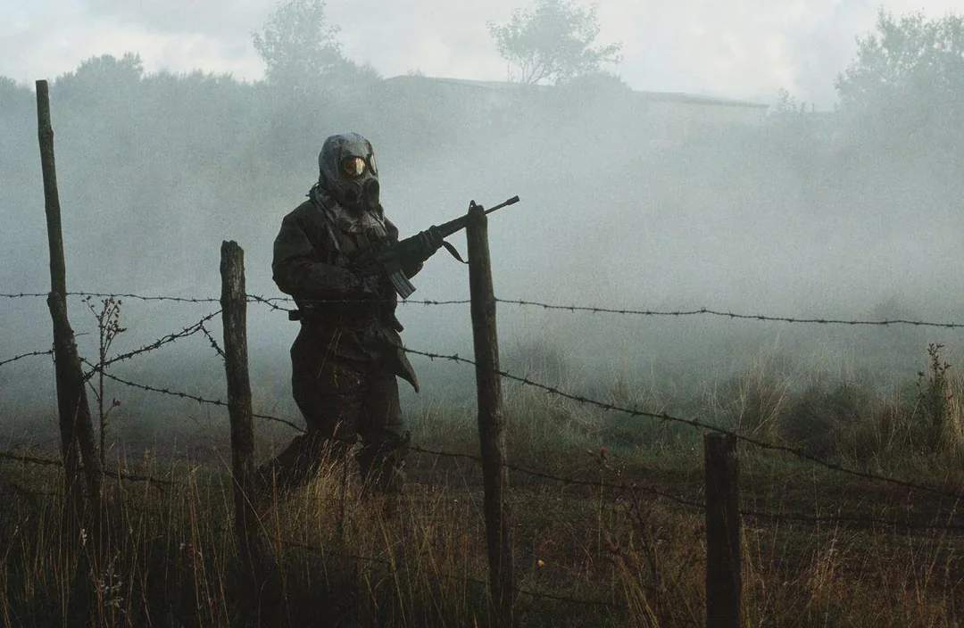 A USAF Security Policeman in his MOPP gear on patrol during Exercise Reforger 83. Sola Air Station, Norway, 19 Sept 1983