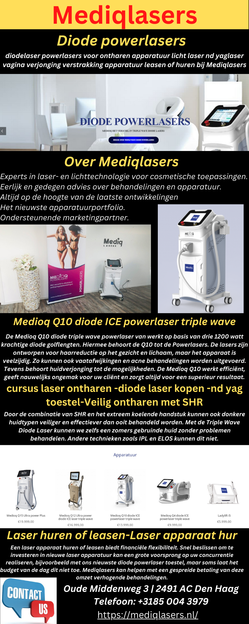 De Medioq Q10 diode triple wave powerlaser van werkt op basis van drie 1200 watt krachtige diode golflengten. Hiermee behoort de Q10 tot de Powerlasers. De lasers zijn ontworpen voor haarreductie op het gezicht en lichaam, maar het apparaat is veelzijdig. Zo kunnen ook vaatafwijkingen en acne behandelingen worden uitgevoerd. Tevens behoort huidverjonging tot de mogelijkheden. De Medioq Q10 werkt efficiënt, geeft nauwelijks ongemak voor uw cliënt en zorgt altijd voor een superieur resultaat. https://mediqlasers.nl/product/medioq-q10-diodelaser/