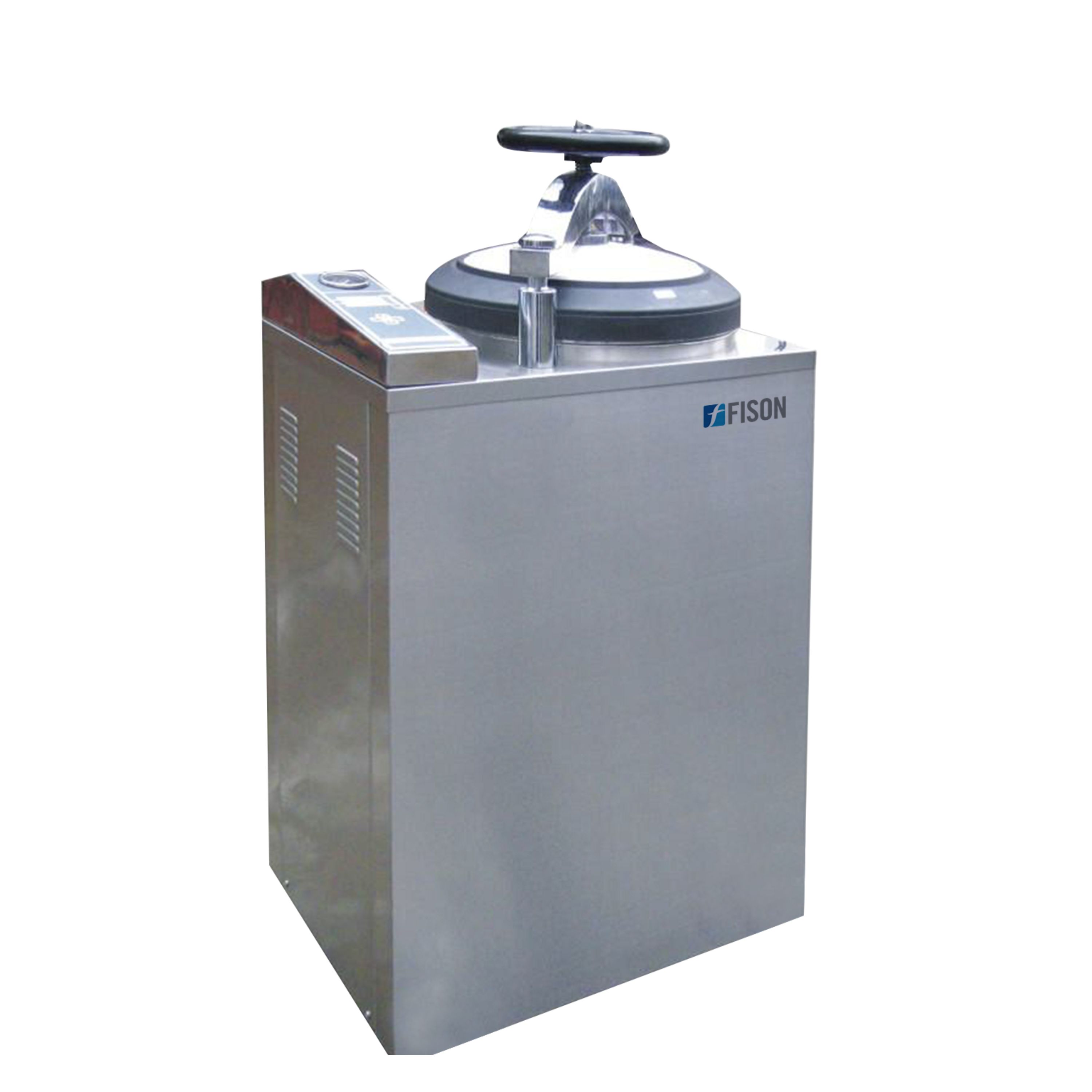 Fison Vertical Autoclave is a 50L top-loading sterilizer with a 134°C temperature and 0.22 MPa pressure. It features a quick handwheel door, stainless steel baskets, an indicator light and a steam water circulation system. Built with durable 304-grade stainless steel, it includes a beep alarm, PT/TT testing connector and is CE certified for reliable performance.