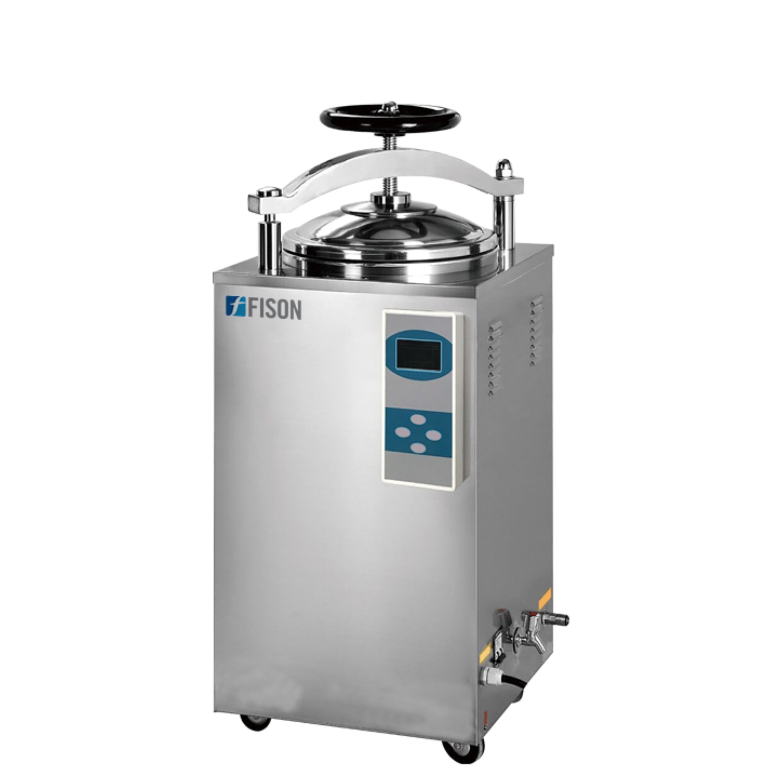 Fison Vertical Autoclave is a top-loading pressure steam sterilizer with a durable stainless steel design and a quick-open hand wheel door with a self-inflating seal. It features a 35L chamber, drying function, 134°C sterilization temperature, 0.22 MPa pressure and a digital LCD with a touch keypad. Reliable and compliant with international standards.