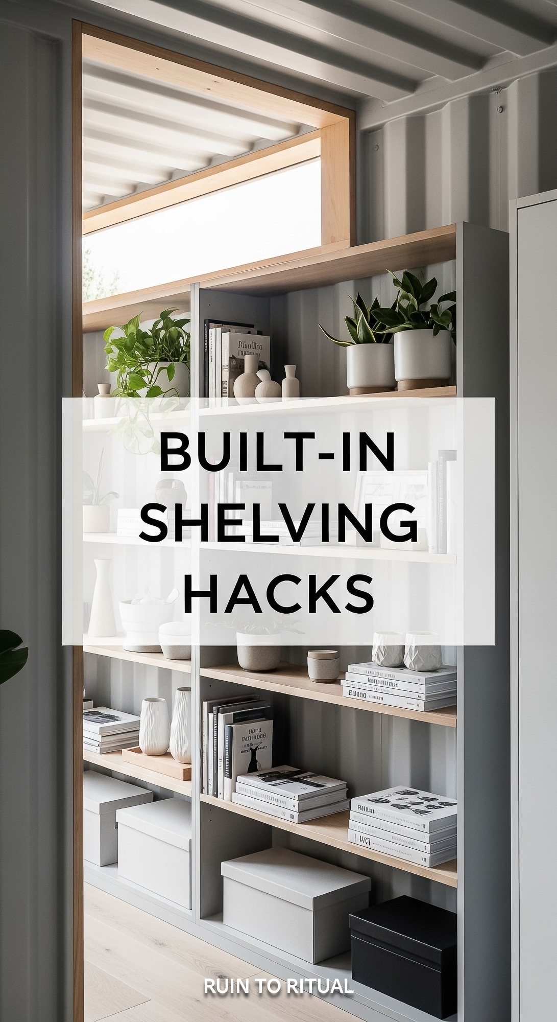 Vertical Pintereststyle image of container home with builtin shelving Centered overlay text reads Bu