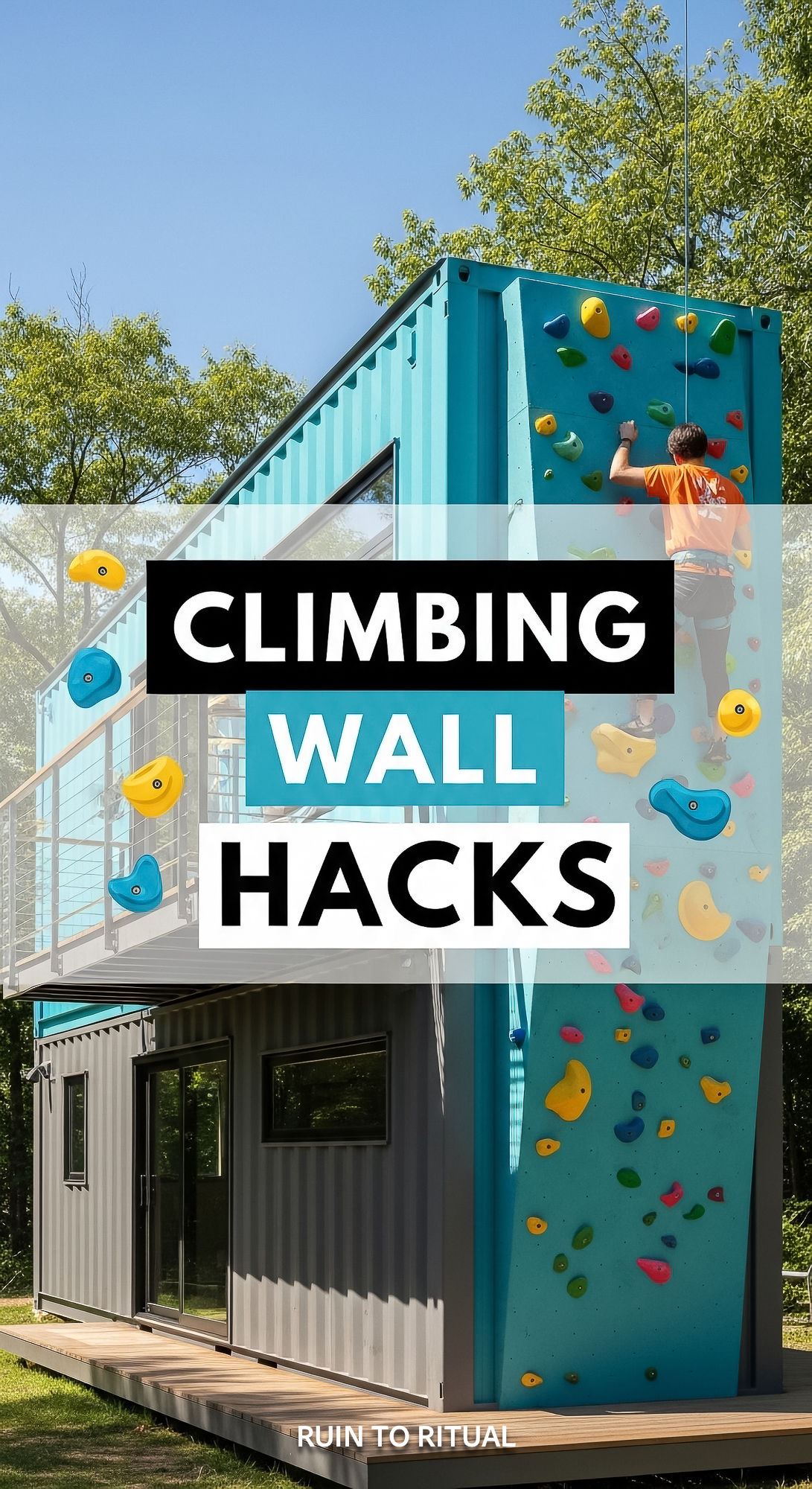 Vertical Pintereststyle image of container home with climbing wall Centered overlay text reads Climb
