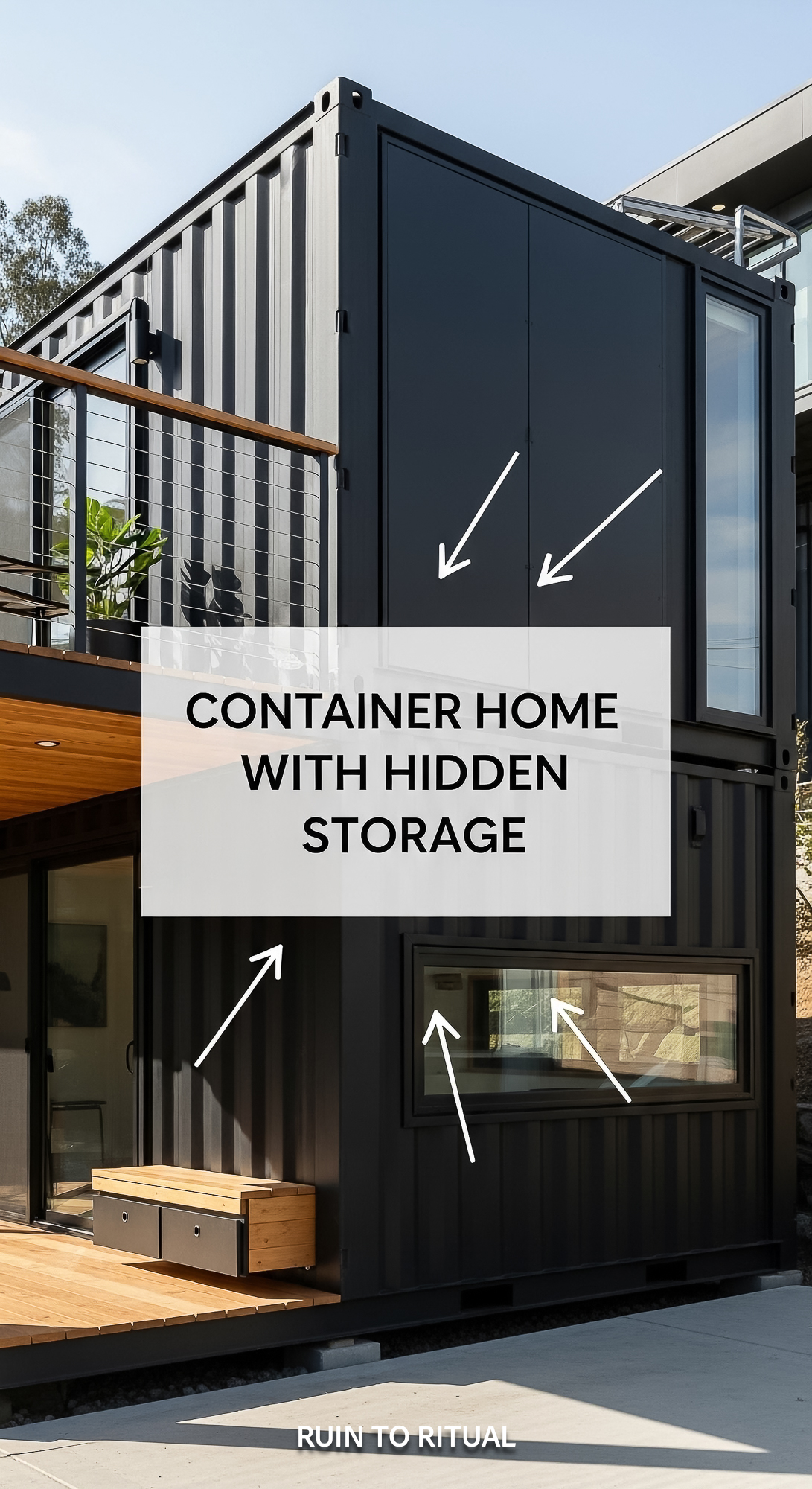 Vertical Pintereststyle image of container home with hidden storage compartments Centered overlay te