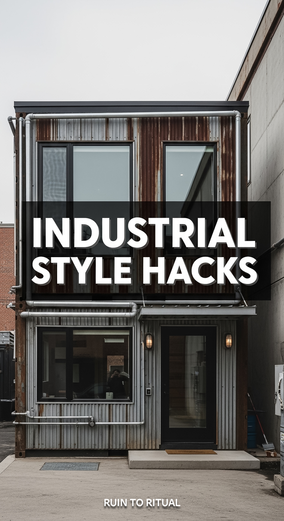 Vertical Pintereststyle image of container home with industrial style Centered overlay text reads In