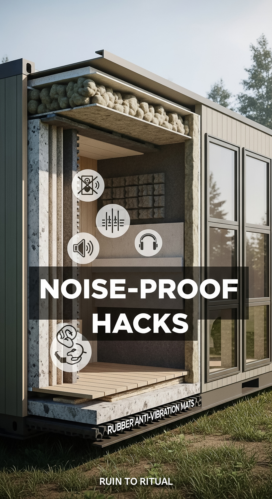 Vertical Pintereststyle image of container home with noise insulation Centered overlay text reads No