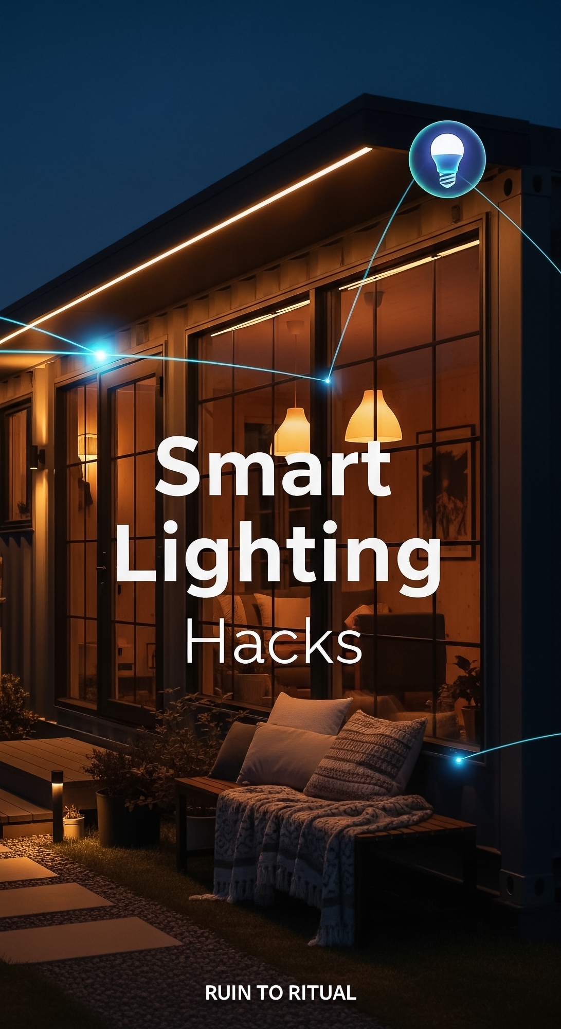 Vertical Pintereststyle image of container home with smart lighting system Centered overlay text rea