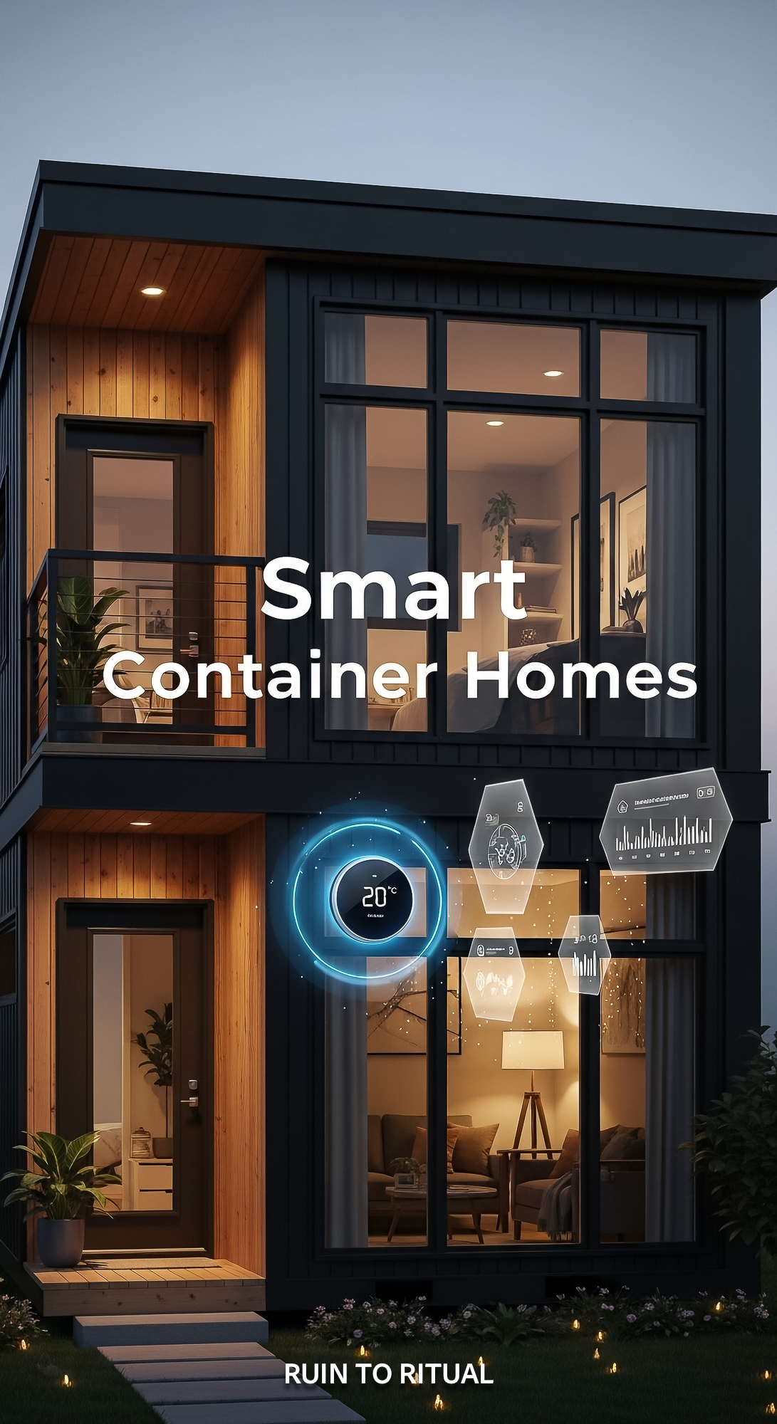 Vertical Pintereststyle image of container home with smart thermostat Centered overlay text reads Sm