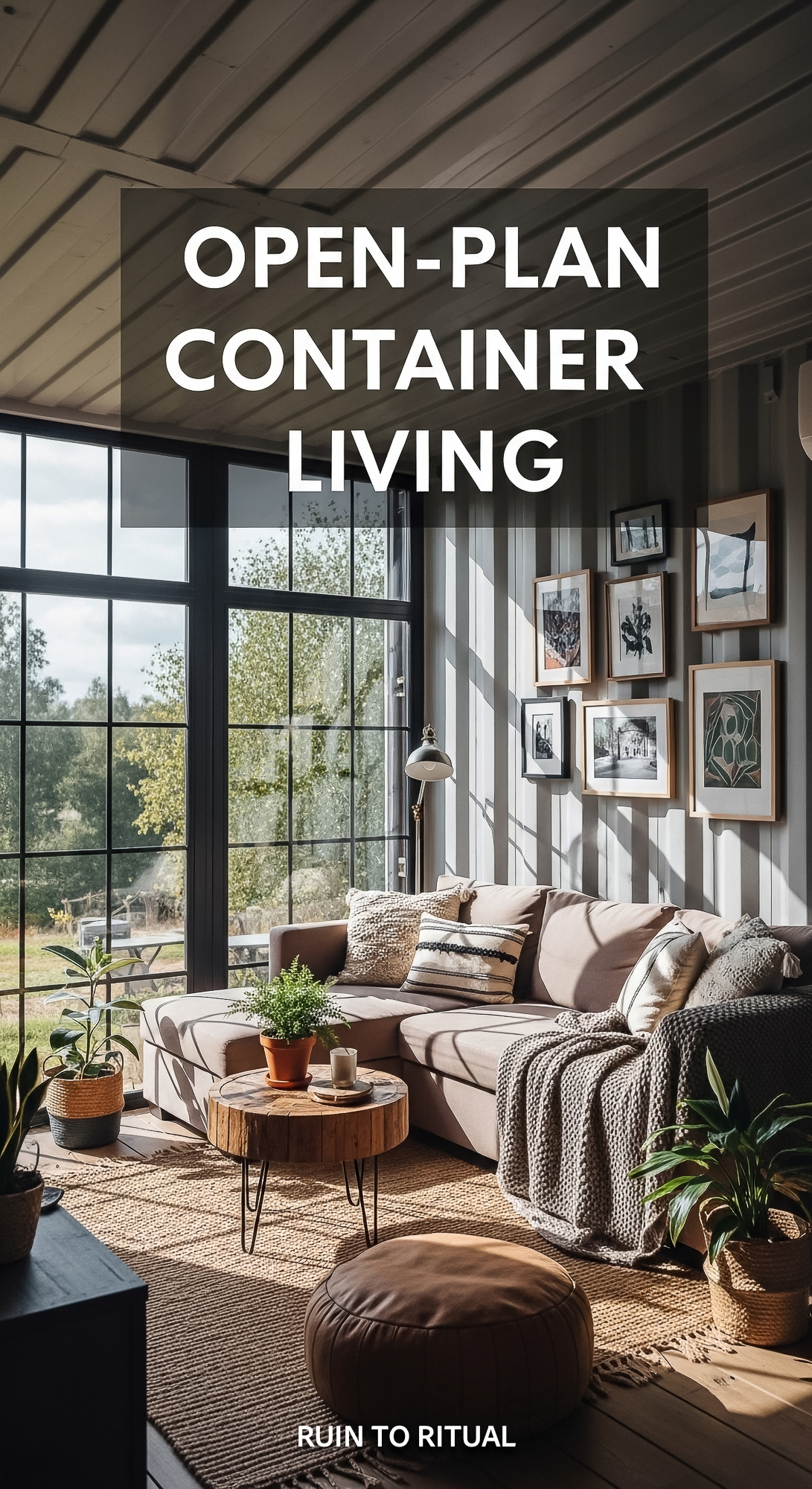 Vertical Pintereststyle image of openplan container living room with large windows and sofa Centered