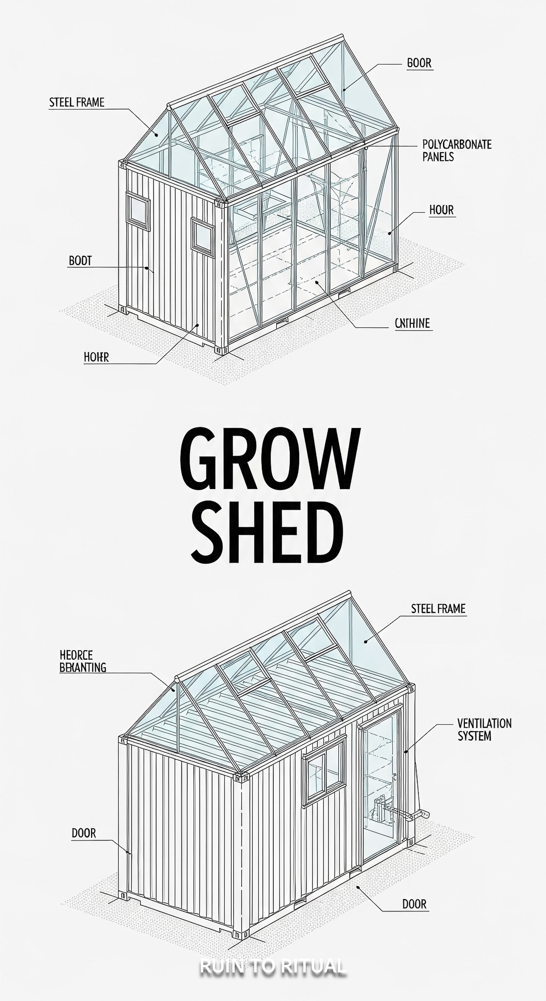 Vertical Pintereststyle image showing a container shed blueprint with greenhouse roof Overlay text r