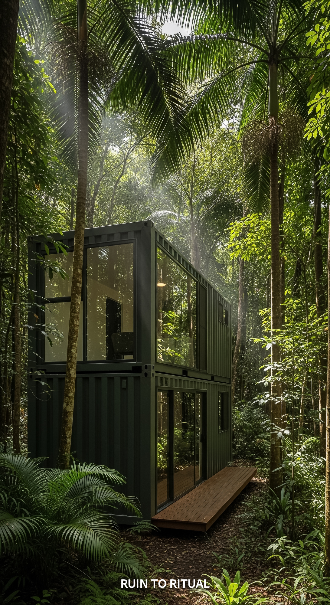 Vertical Pintereststyle image showing a container shed in tropical forest with cinematic daylight No