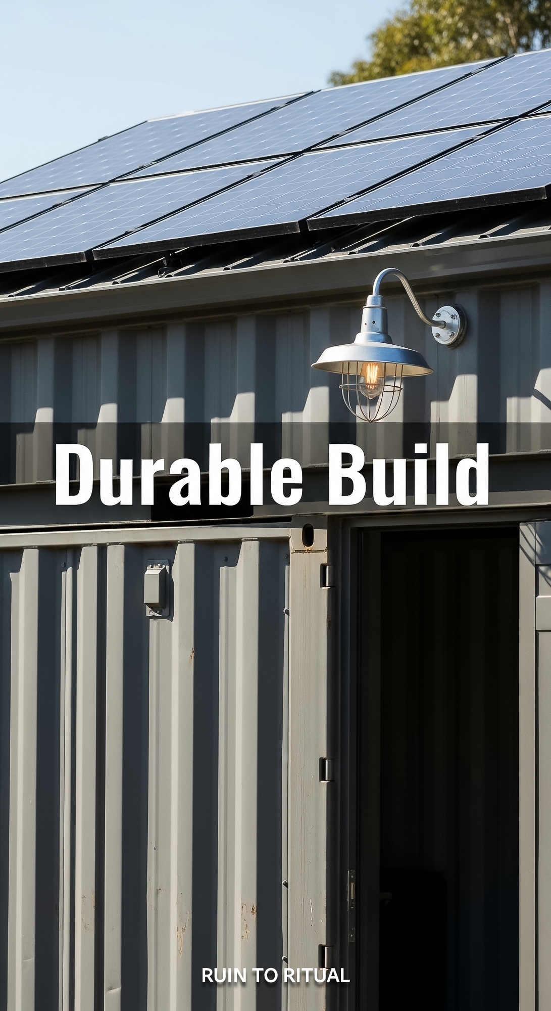 Vertical Pintereststyle image showing a container shed with corrugated steel siding and solar roof O