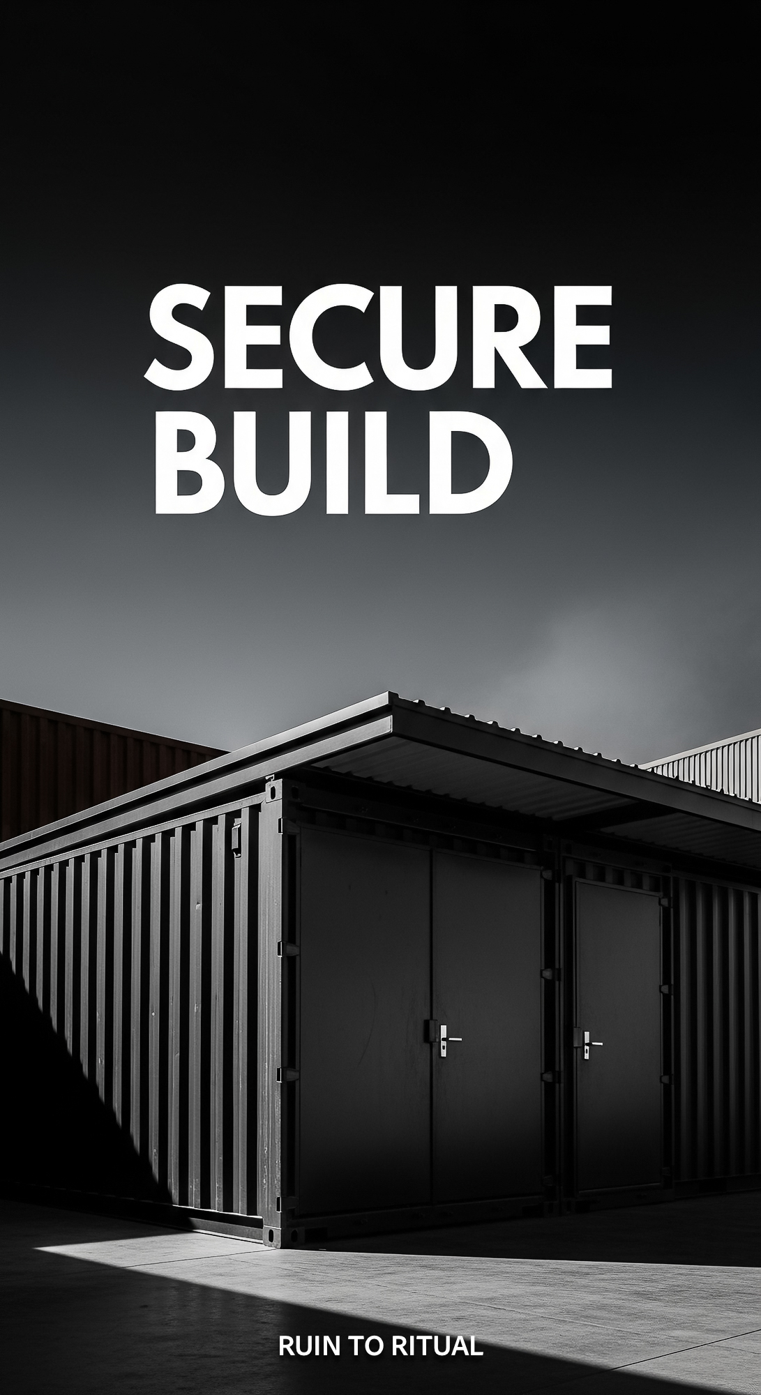 Vertical Pintereststyle image showing a container shed with steel doors and industrial design Overla