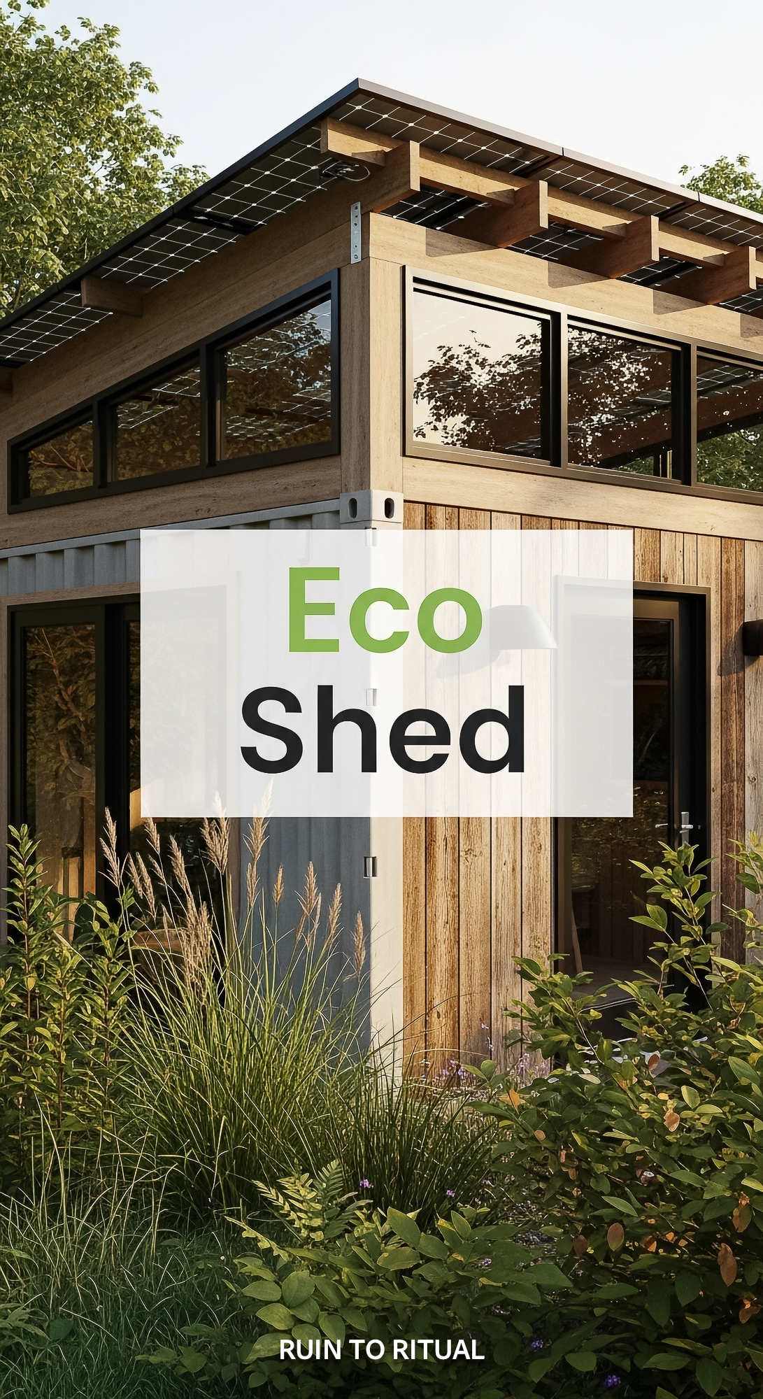 Vertical Pintereststyle image showing a modern shipping container shed with solar panels and rustic