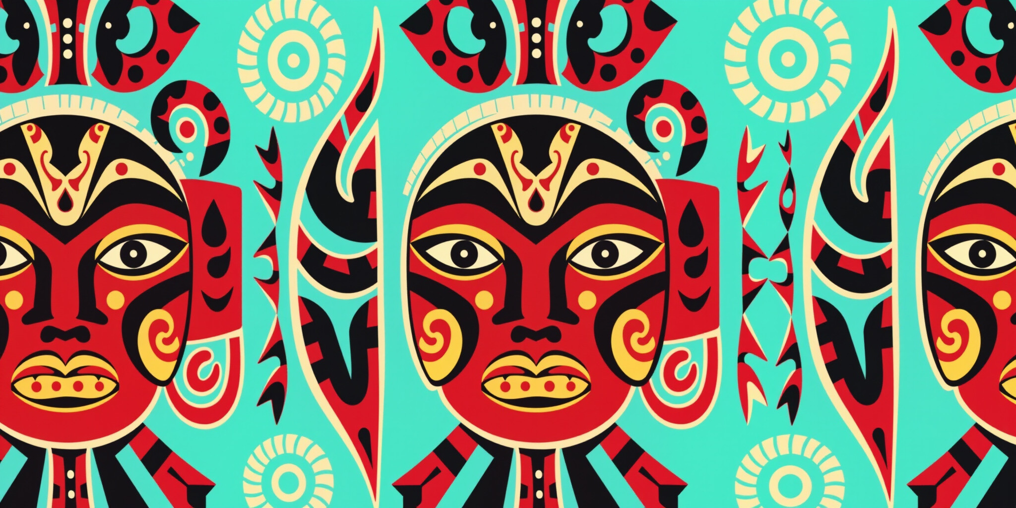 Vibrant tribal pattern featuring a stylized human face with bold geometric shapes swirling lines and