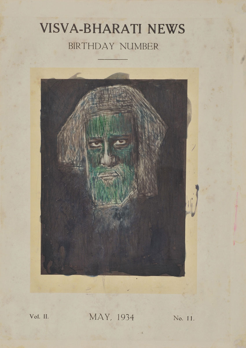 Cover of Visva-Bharati News, Birthday Number, Vol. II, May 1934 (No. 11), featuring an expressive portrait of Rabindranath Tagore in dark, textured brushstrokes with green and earthy tones. The historic publication cover visually reflects literary modernism and artistic introspection, complementing the essay “Toward an Infrathin Reading Writing Practice” on LiteraryActivism.com.
