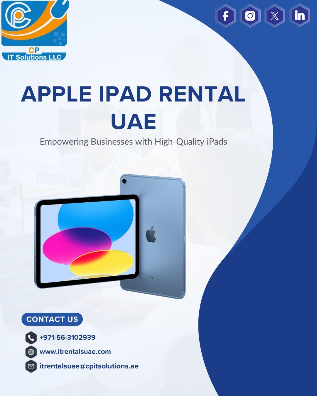 Get the latest devices with CP IT Solutions LLC offering reliable Apple iPad rental UAE services. Ideal for events, training, and business needs with flexible plans and quick delivery. Call +971-56-3102939 for affordable, high-quality rentals today.