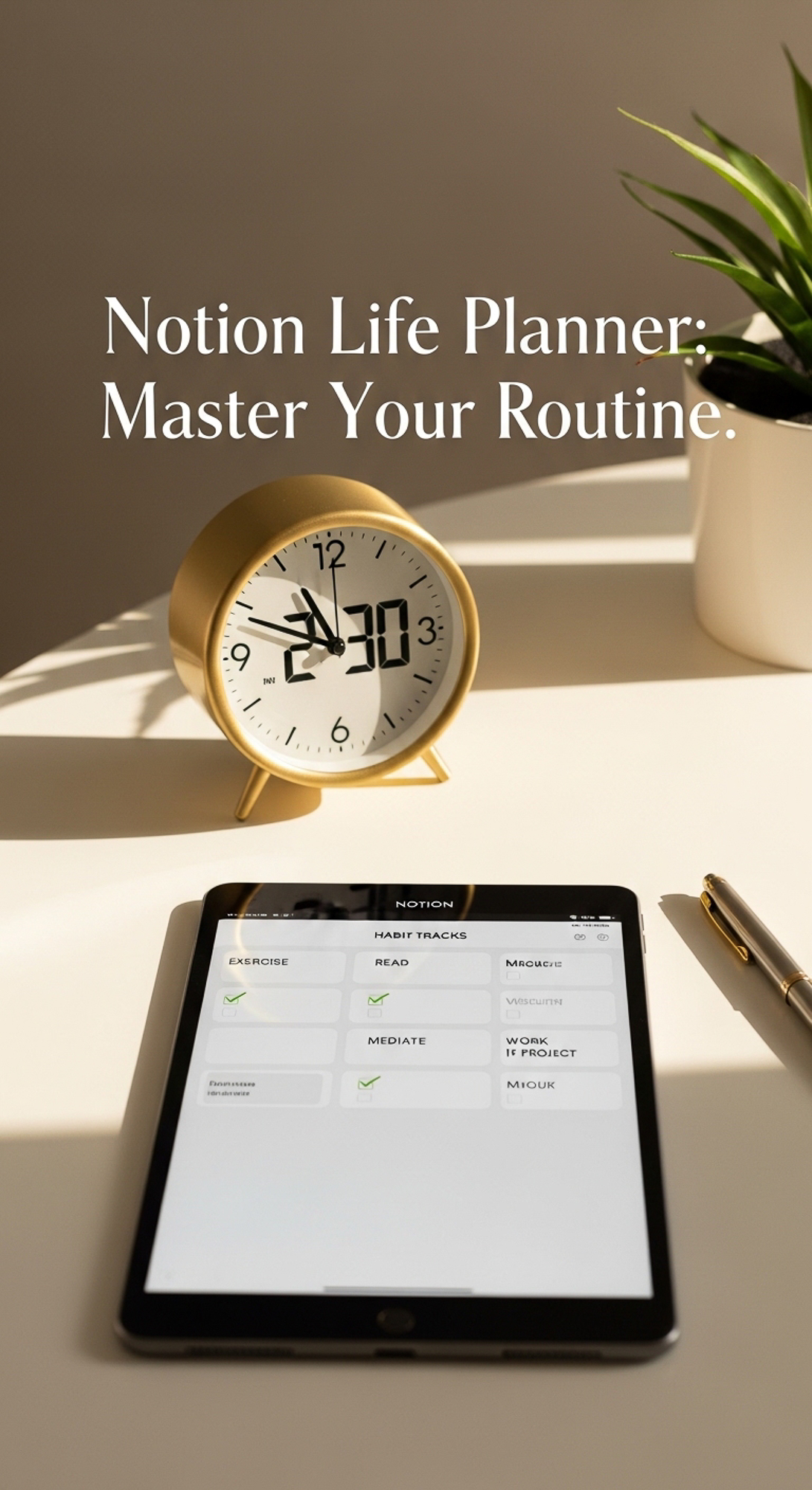Warm afternoon light hitting a clean white workspace with a gold desk clock an iPad showing a Habit