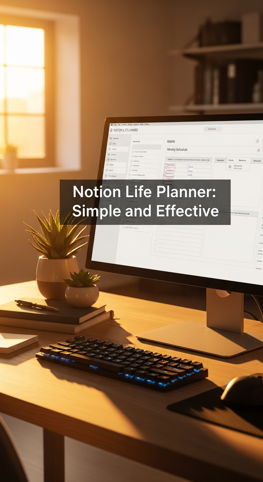 Warm golden hour light on a clean desk with a Notion Life Planner on screen overlay text Notion Life