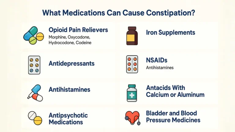 Medications that cause constipation slow down your intestinal muscles. Some draw water out of the stool. Some changes in nerves that control bowel movement. You will often see constipation in people taking medicines for pain, mood, allergies, acid, or bladder problems. Older adults and people taking many drugs face a higher risk. Constipation can begin within days or weeks of starting a medicine.