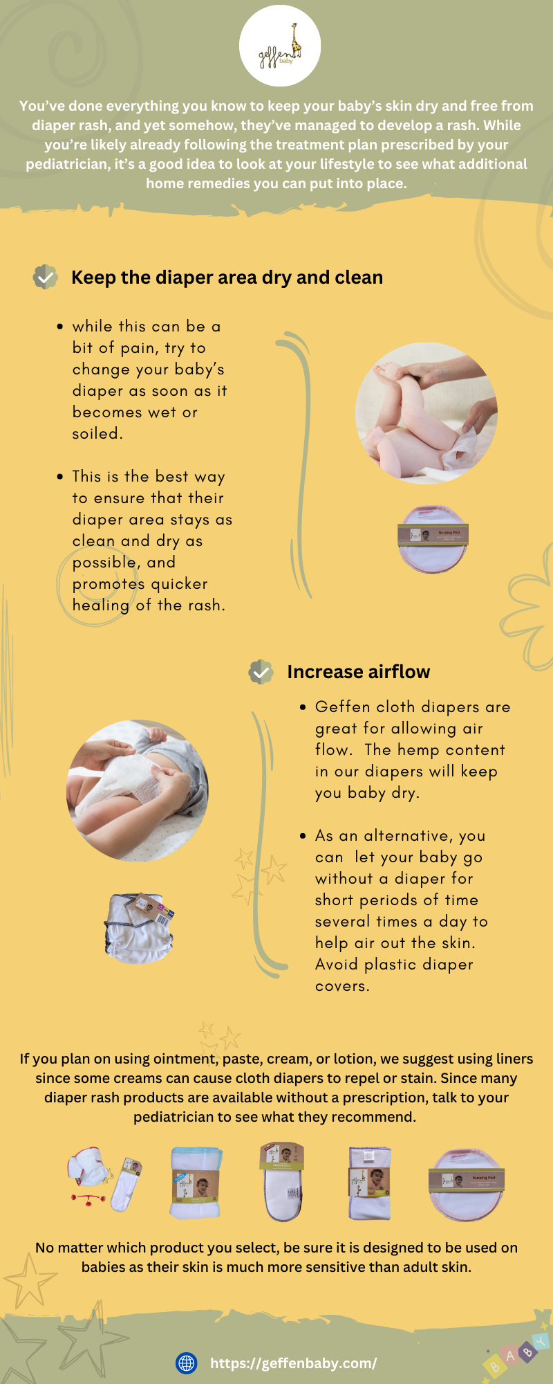 A diaper rash isn't fun for anyone, not even babies. Geffen Baby offers a variety of cloth diaper supplies to keep your baby's skin dry and comfortable.
