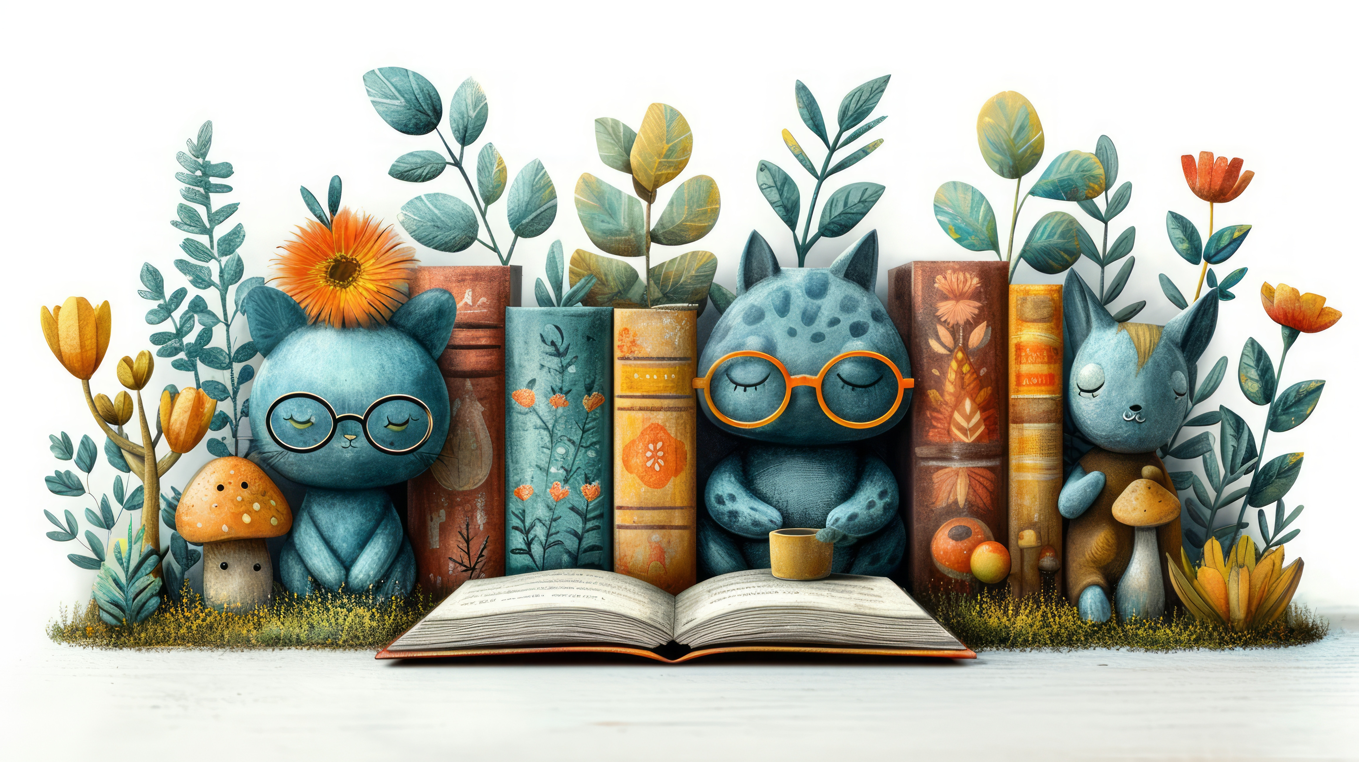 whimsical illistration of A forest where animals wear glasses and read giant booksperfect book illus