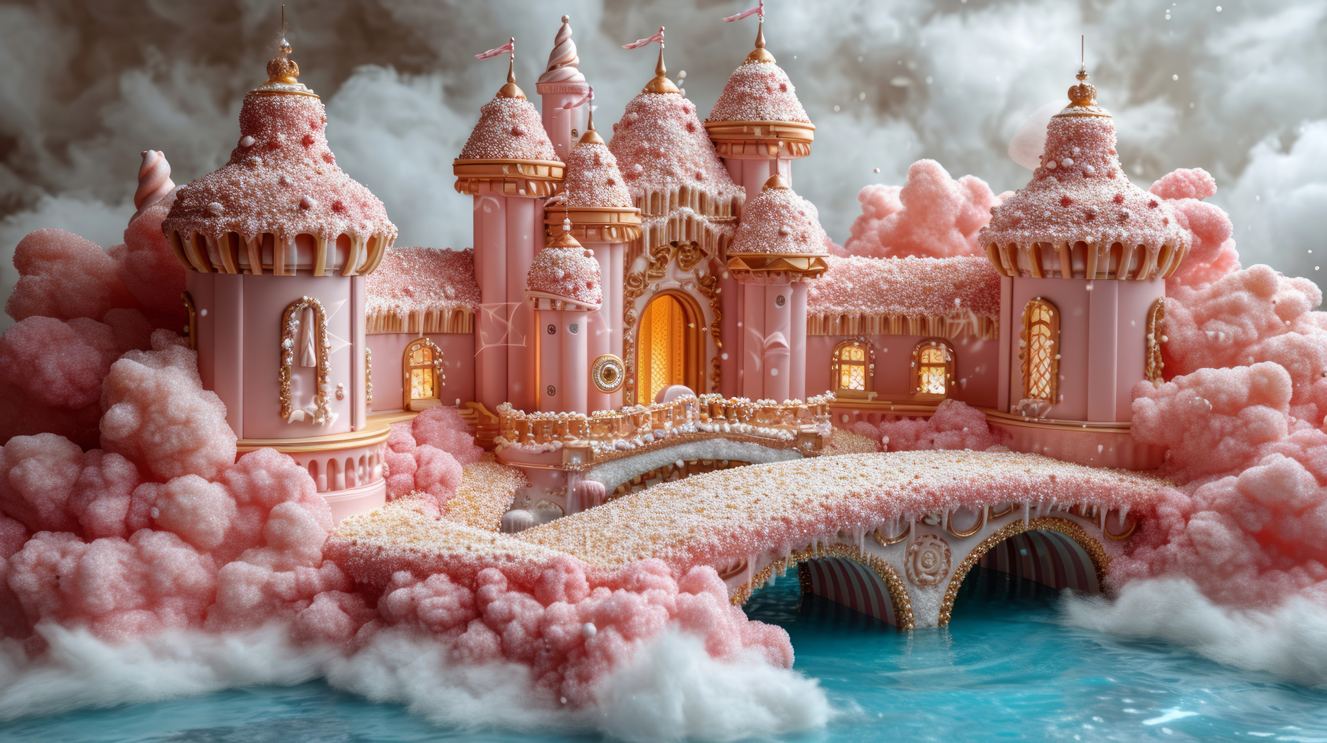whimsical illistration of A magical bridge made of candy leading to a chocolate castleperfect book i