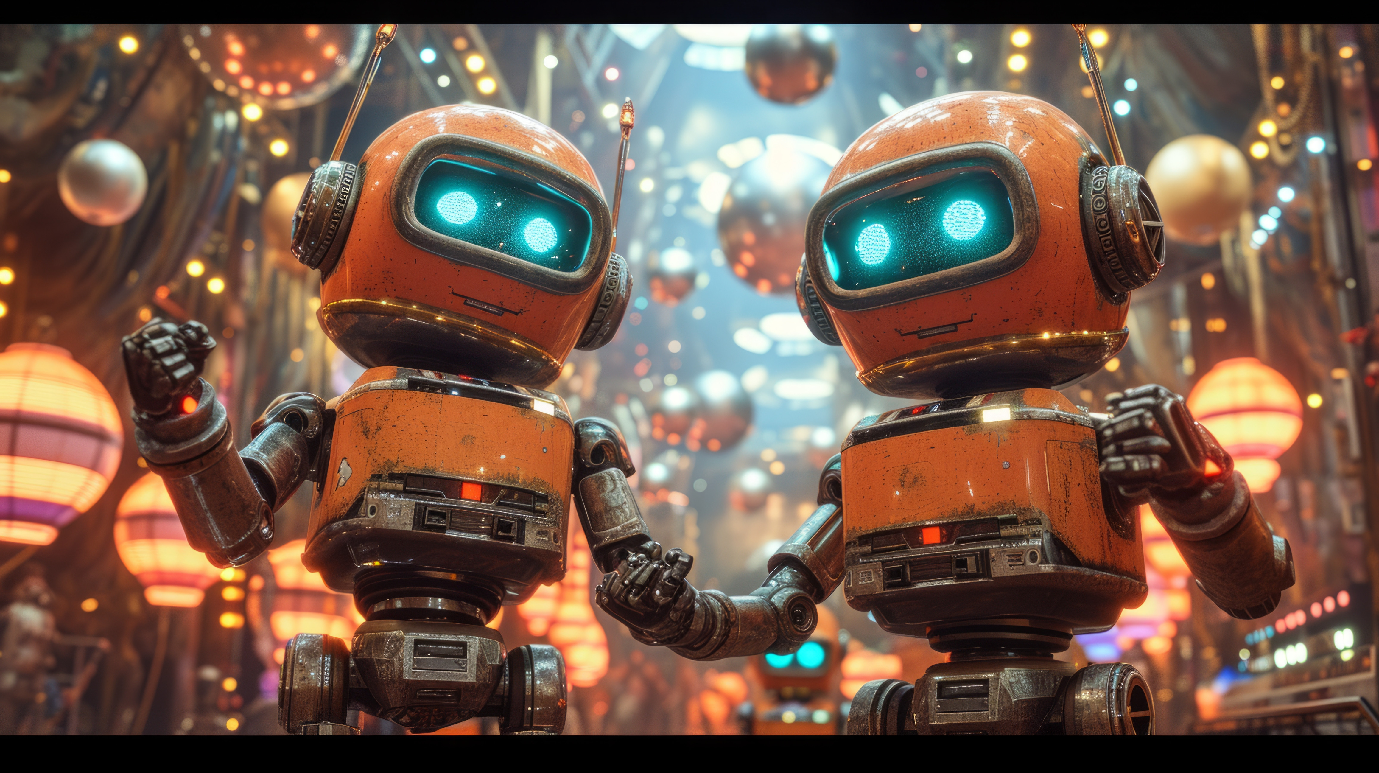 whimsical illistration of Robots having a dance party in a disco ball factoryperfect book illustrati