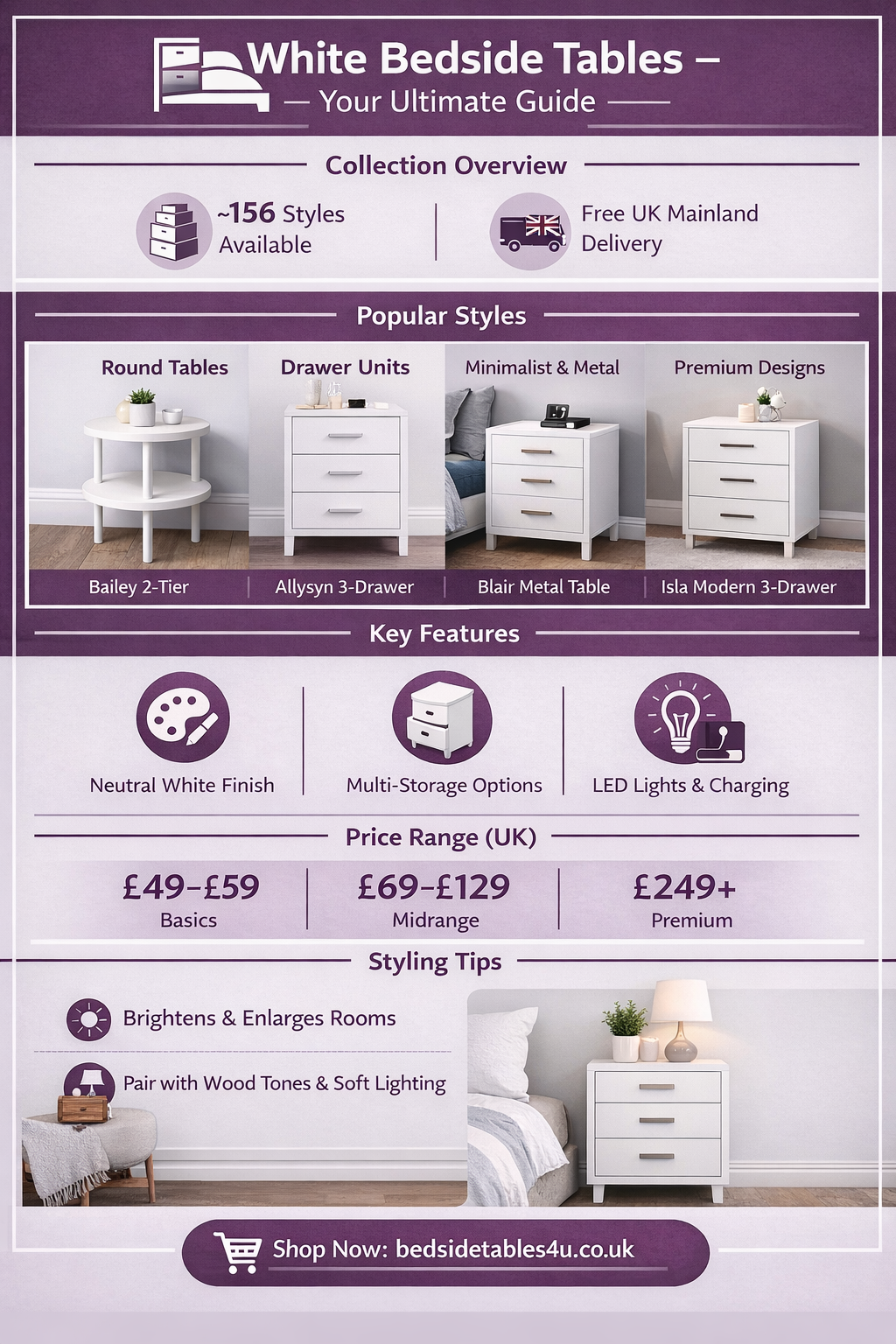 Enhance your bedroom with stylish and functional Bedside Cabinets White Gloss. Perfect for modern interiors, these bedside tables combine sleek design with practical storage, offering drawers and shelves to keep essentials organized. The glossy white finish brightens any room, creating a clean and spacious feel. From minimalist round tables to multi-drawer premium designs, there’s a style to suit every taste and space. Ideal for pairing with wood tones, soft lighting, or contemporary bedding, these bedside cabinets not only elevate the look of your bedroom but also provide convenient accessibility. Discover the perfect balance of elegance and practicality today.