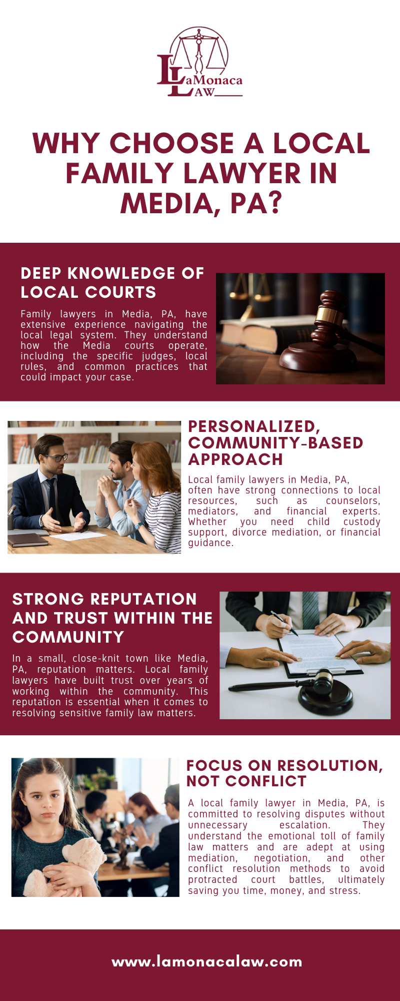 This infographic explains why picking a local family lawyer in Media, PA, is a smart choice. Local lawyers know the court system and community well, which helps them represent you effectively. They provide personalized support and can connect you with local experts like mediators and counselors. Known for their good reputation, they focus on solving problems through mediation, which saves you time, money, and stress, while focusing on what’s best for your family’s future. For more information, visit: https://www.lamonacalaw.com/practice-areas/family-law/