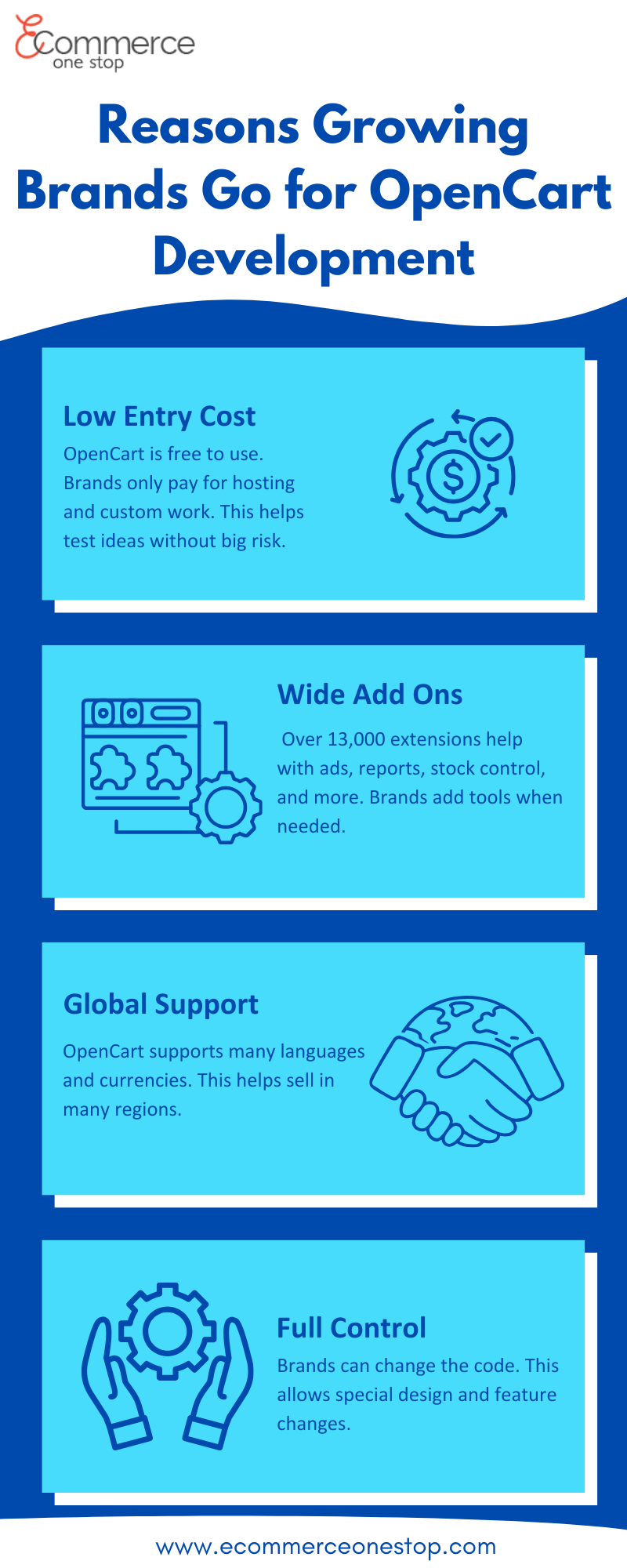 OpenCart gives growing brands a practical edge with low setup cost, flexible extensions, global readiness, and full code control. It’s ideal for businesses that want scalability without platform restrictions. Build a store that grows with you. Start your OpenCart project today.