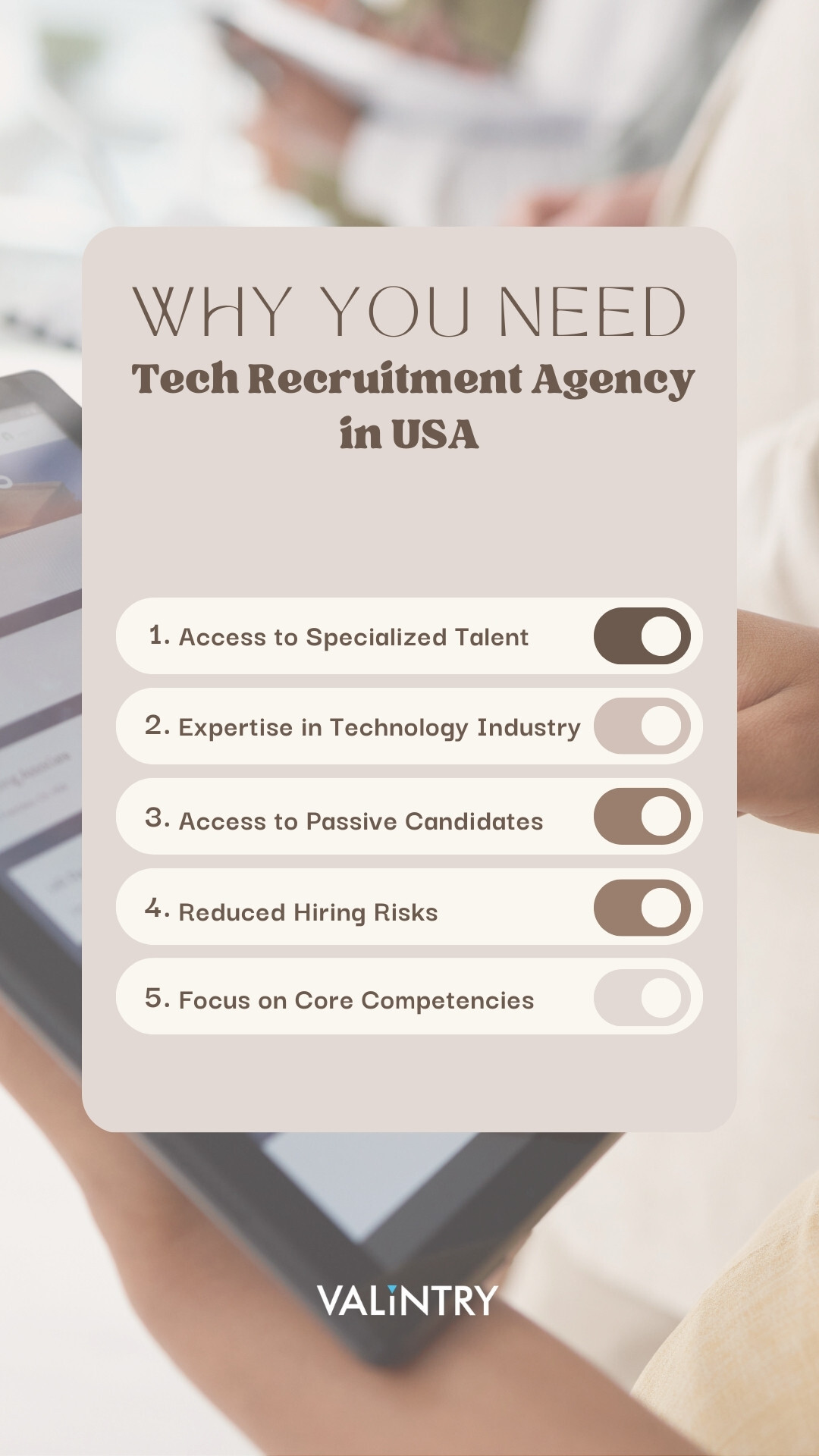 A Tech Recruitment Agency in the USA, such as VALiNTRY, plays a crucial role in connecting employers with top-tier tech talent. These agencies specialize in identifying, vetting, and placing skilled professionals in the ever-evolving tech industry. With a deep understanding of the market, VALiNTRY streamlines the hiring process, saving companies time and resources. Whether seeking software developers, IT specialists, or other tech professionals, partnering with a reputable recruitment agency ensures access to a diverse pool of qualified candidates, ultimately contributing to the success and growth of tech-driven businesses.