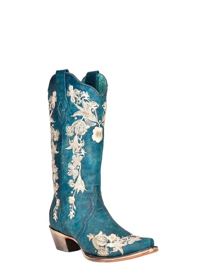 WOMENS WHITE FLORAL EMBROIDERY WITH CRYSTALS NAVY BLUE SNIP TOE COWBOY BOOT A4361 430a05ed b887 4e7c