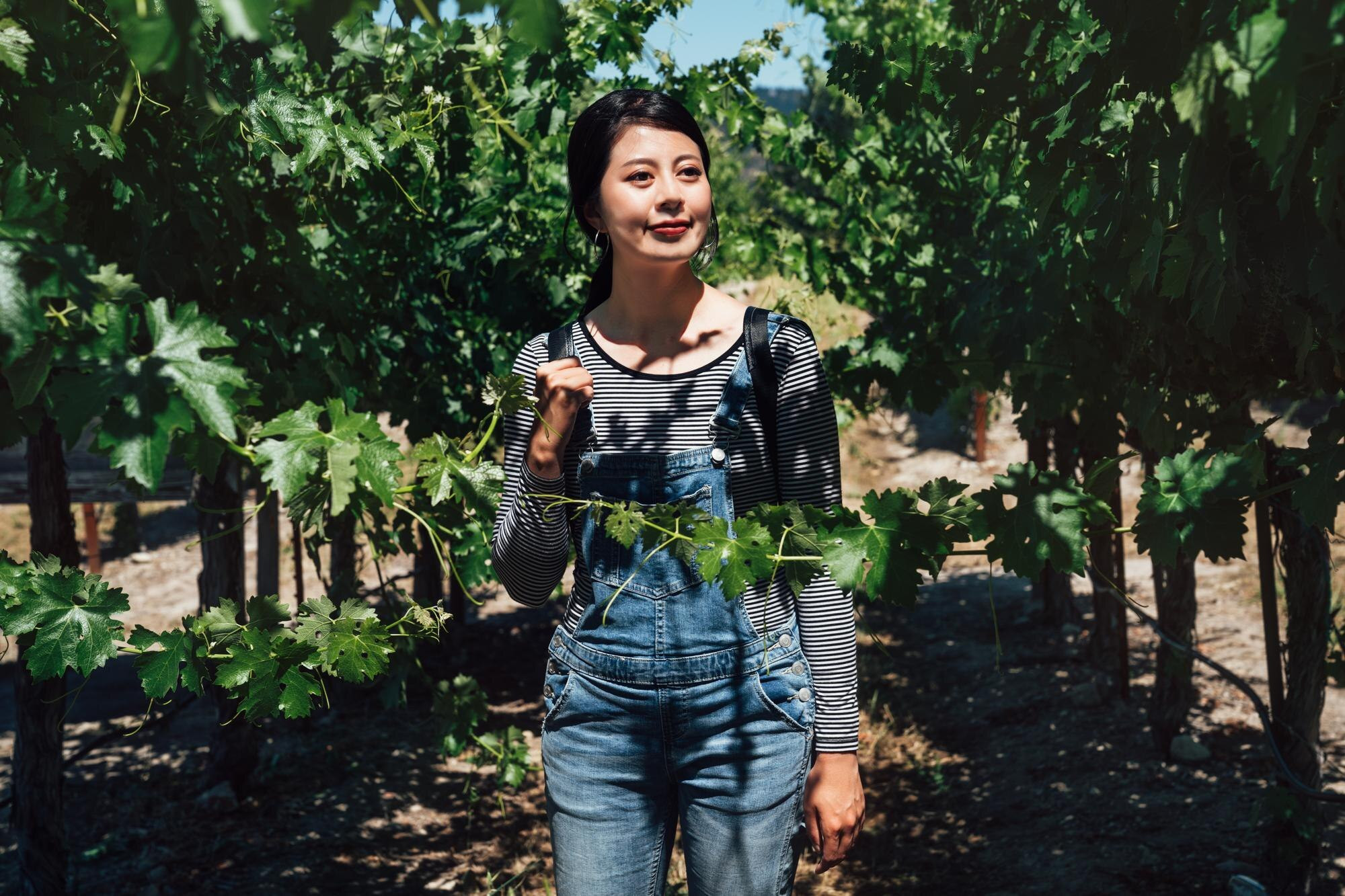 young asian tourist travel visit napa valley grape winery san francisco usa cute girl overalls smili